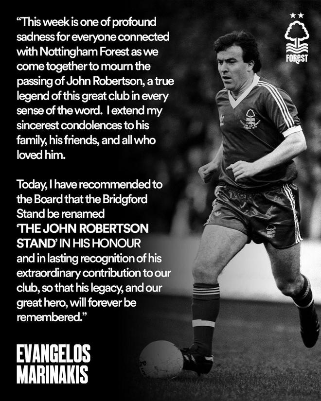 “本周對所有與諾丁漢森林相關的人而言,都是充滿深切悲痛的一周——我們齊聚在此,悼念約翰-羅伯遜的離世。無論從哪個角度說,他都是這家偉大俱樂部的真正傳奇。我向他的家人、朋友,以及所有深愛他的人,致以最誠摯的慰問。