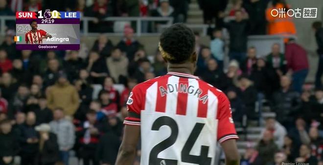 上半場進行到第28分鐘,桑德蘭前場左側(cè)邊線球拋入禁區(qū),利茲聯(lián)球員解圍沒能踢遠,扎卡弧頂奪回球權(quán)轉(zhuǎn)身直接送出精裝直塞,阿丁格拉前插小角度冷靜推射遠角破門,桑德蘭在主場率先打破僵局。