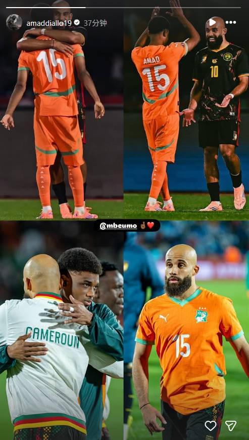 非洲杯科特迪瓦1-1戰(zhàn)平喀麥隆,阿馬德賽后曬與姆伯莫照片